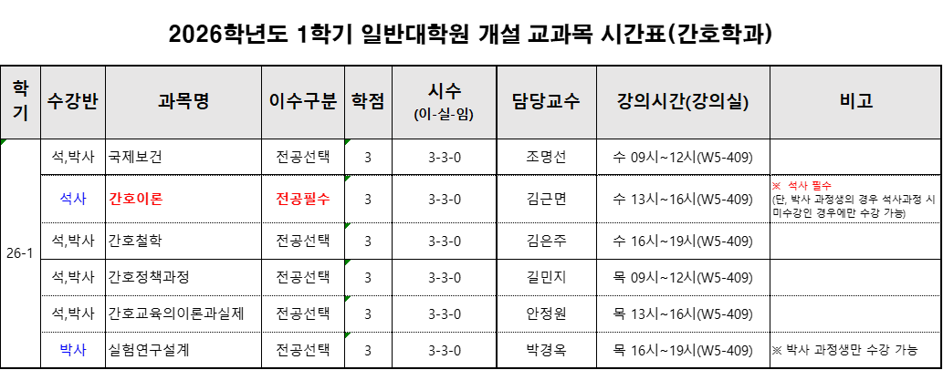 2026학년도 1학기 일반대학원 간호학과 시간표 안내