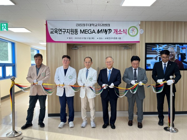 강릉원주대학교치과병원(병원장 박찬진)은 지난 7월 31일, 교육‧연구지원동 내 ‘메가마인드(MEGA’MIND)’ 개소식을 개최했다. 이번 공간은 ㈜메가젠임플란트(대표이사 박광범)의 후원으로 조성되었으며, 교육‧연구지원동 내 첨단 강의시설과 원내생의 학습 편의를 위한 대기공간 등으로 구성되었다.
