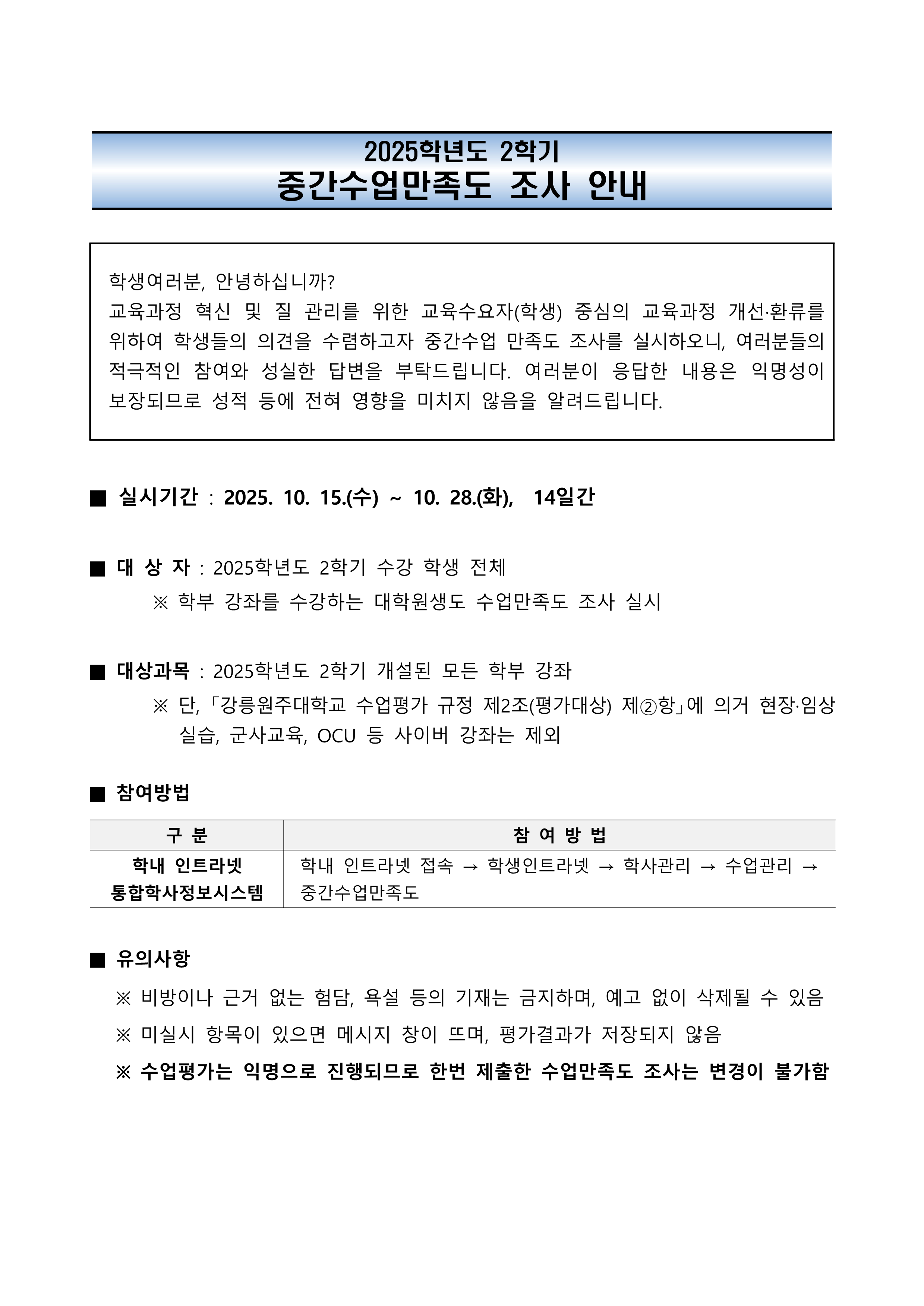 fnctId=bbs,fnctNo=877 2025학년도 2학기 중간 수업만족도(수업평가) 조사 안내 및 협조 요청 작성일 2025.10.02 작성자 정하나 조회수 790 첨부파일 3. 강릉원주대학교 중간수업만족도 매뉴얼(학생용)-2-3.pdf