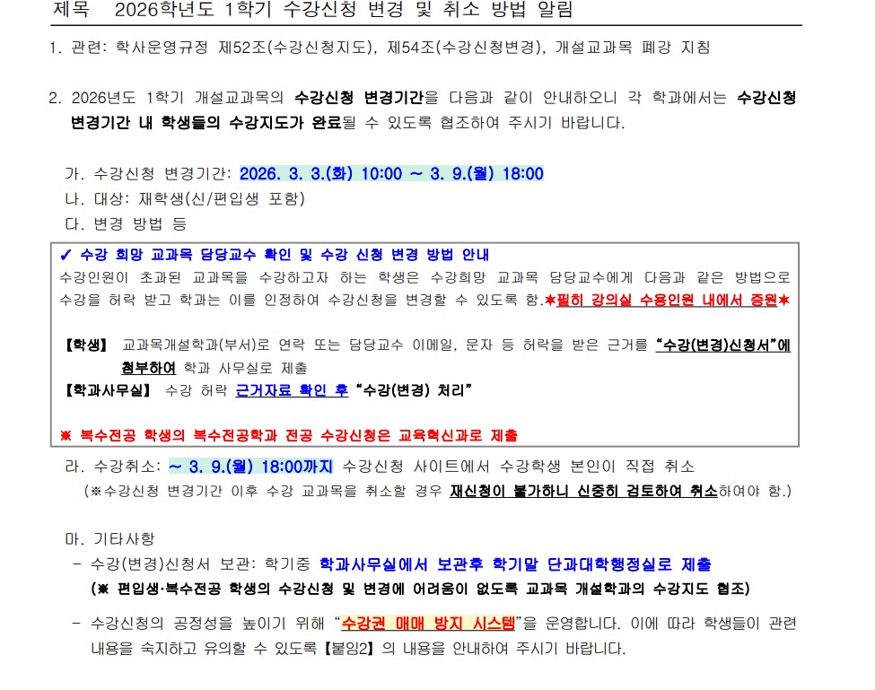 fnctId=bbs,fnctNo=642 2026학년도 1학기 수강신청 변경 및 취소 방법 알림 작성일 2026.02.26 작성자 노종민 조회수 73 첨부파일 2026학년도 1학기 수강권 매매 방지 시스템 운영 안내(수강신청 변경기간).hwp 수강신청 변경 신청서(2026).hwp