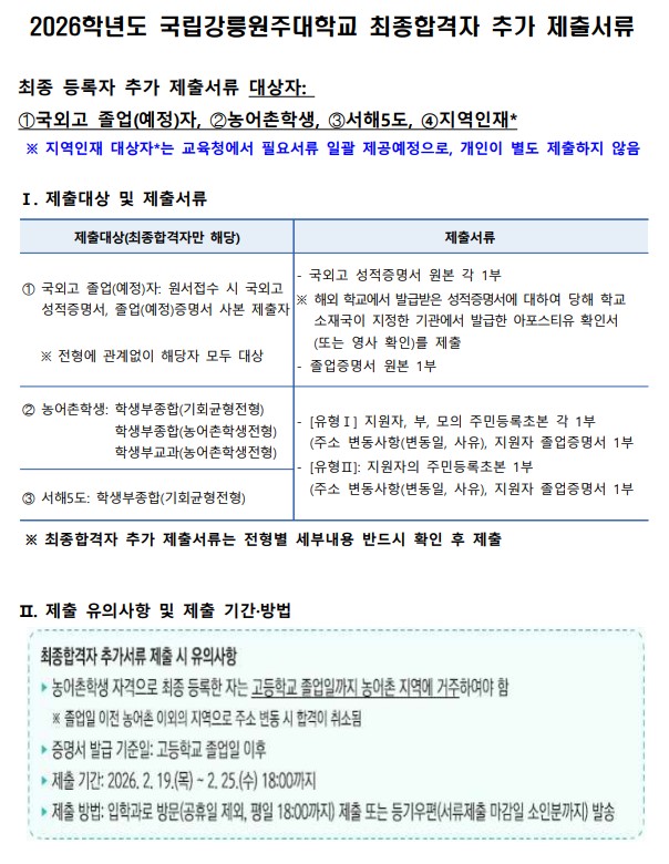 fnctId=bbs,fnctNo=1606 2026학년도 수시모집 최종합격자 추가 제출서류 안내 분류 수시모집 작성일 2026.02.04 작성자 박재원 조회수 1789 발송 주소지: [25457]강원특별자치도 강릉시 죽헌길 7 국립강릉원주대학교 입학과(대학본부C6, 1층 111호) 첨부파일 2026학년도 최종합격자 추가 제출서류.pdf